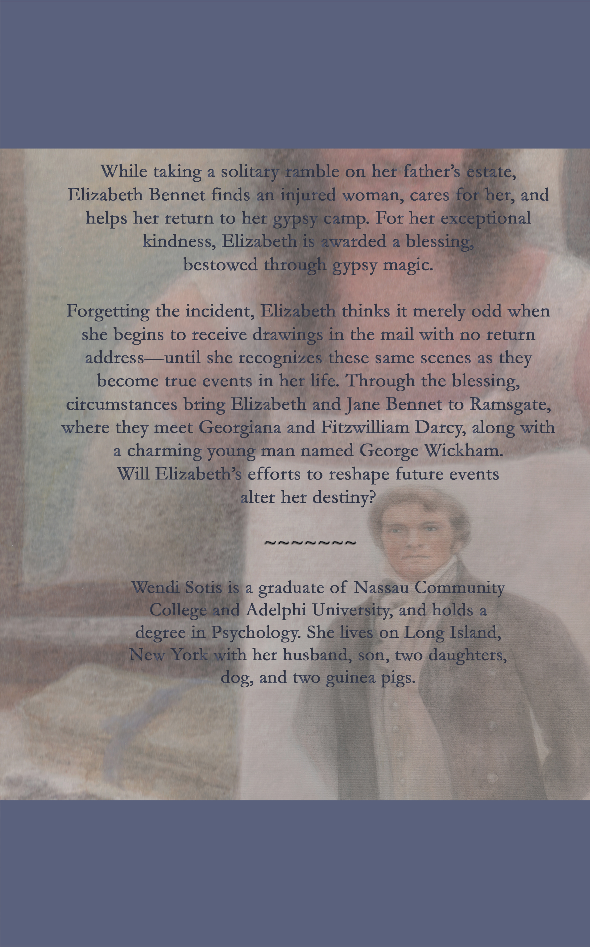 While taking a solitary ramble on her father’s estate, Elizabeth Bennet finds an injured woman, cares for her, and helps her return to her gypsy camp. For her exceptional kindness, Elizabeth is awarded a blessing, bestowed through gypsy magic. Forgetting the incident, Elizabeth thinks it merely odd when she begins to receive drawings in the mail with no return address—until she recognizes these same scenes as they become true events in her life. Through the blessing, circumstances bring Elizabeth and Jane Bennet to Ramsgate, where they meet Georgiana and Fitzwilliam Darcy, along with a charming young man named George Wickham. Will Elizabeth’s efforts to reshape future events also alter her destiny?