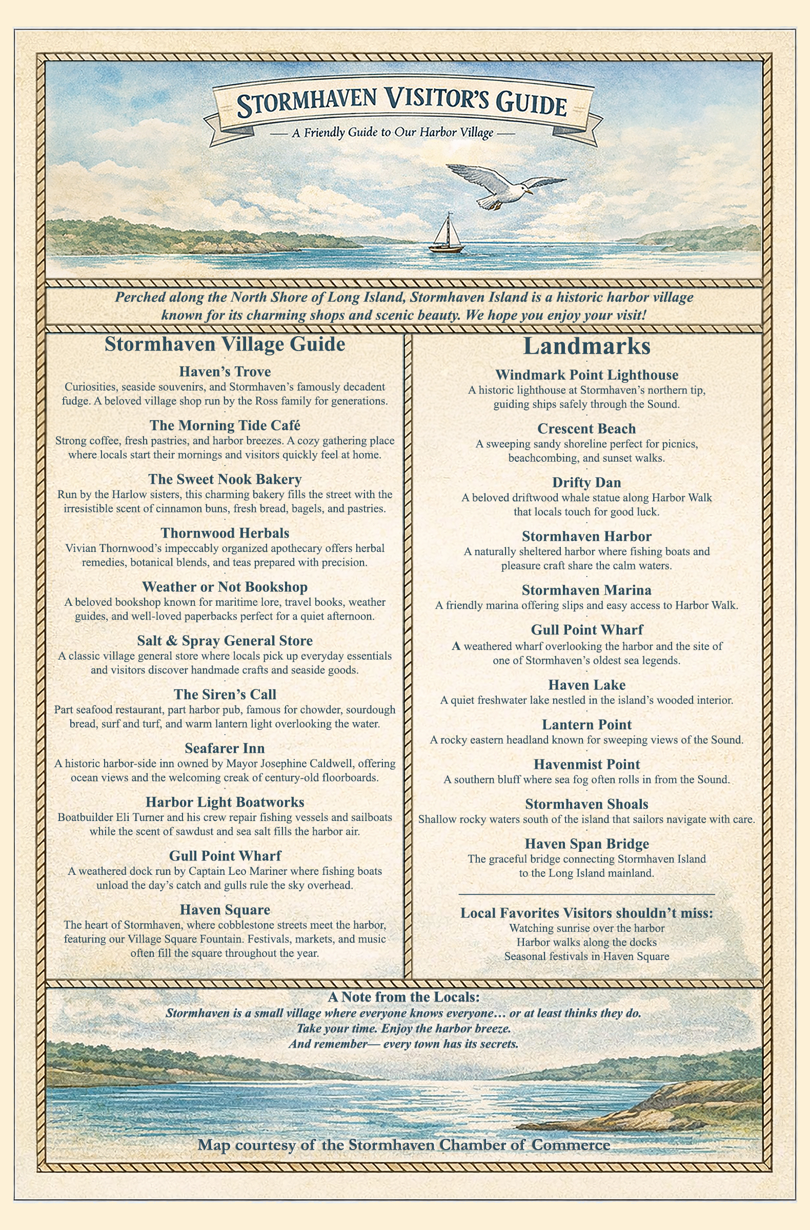 Welcome to Stormhaven Island! Our charming seaside village is filled with cozy shops, harbor breezes, and magic hiding in plain sight. At Haven’s Trove, Olivia Ross helps customers find exactly what they need… even if they don’t realize it yet. But life in Stormhaven isn’t always as peaceful as it seems.